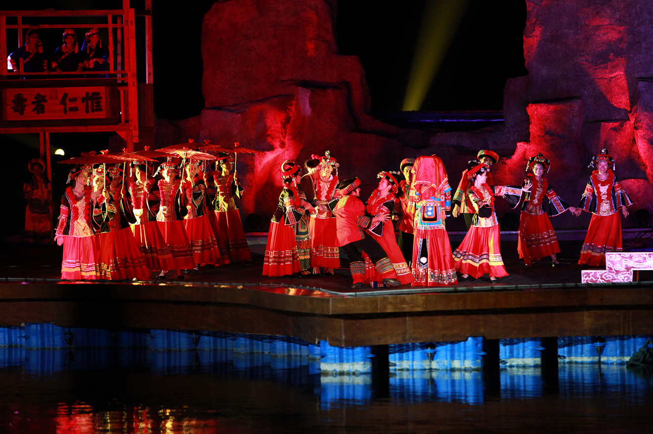 梦·巴马 大型山水实景演出《梦・巴马》由寿乡旅游集团聘请专业演艺团队策划打造,以睡美人山和赐福湖为背景,将壮丽的山水实景与震撼的视听效果、灯光艺术有机融合,创造出如梦似幻的审美体验。 演出通过灯光、音响及舞蹈演员与当地群众的共同参与,生动呈现了巴马瑶族婚礼、铜鼓、补粮、天浴等特色民俗风情,充分展示巴马的秀丽风光与长寿文化。整场表演以歌舞为载体,情景交融,既展现了当地人民勤劳富足、开放包容的幸福生活,也寄托了巴马群众对生产生活风调雨顺、社会团结和谐的美好愿景。 |